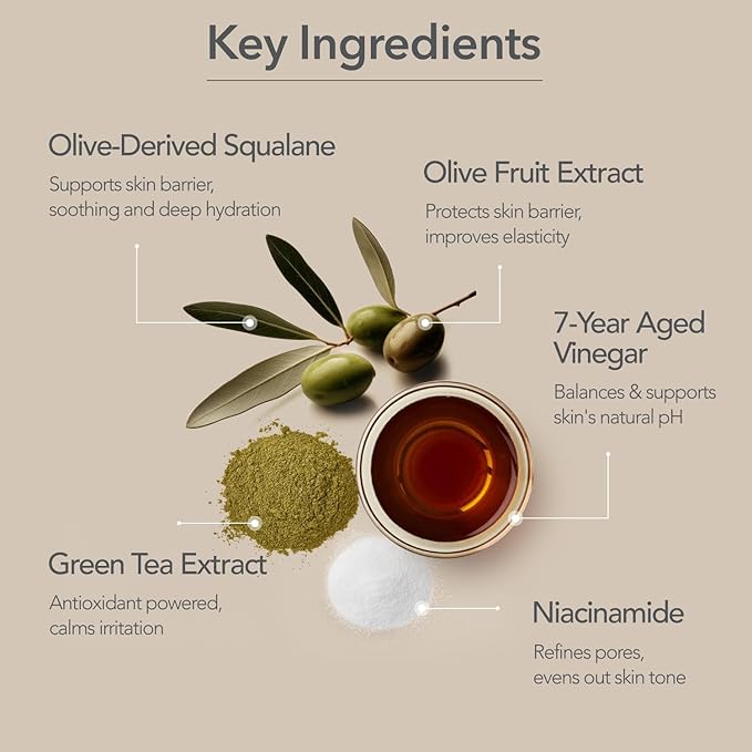 - DEEPLY HYDRATING & NOURISHING : Formulated with 7-year-aged vinegar, squalane, olive extract, and niacinamide to hydrate, nourish, and improve skin tone and texture.