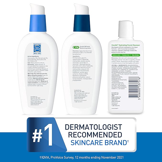 - [ OIL FREE DAY CREAM & NIGHT CREAM & HYDRATING FACE WASH FOR TRAVEL ] Skin care kit contains a 3oz CeraVe AM Facial Moisturizing Lotion with SPF 30, a full size 3oz CeraVe PM Facial Moisturizing Lotion, a 3oz CeraVe Hydrating Facial Cleanser