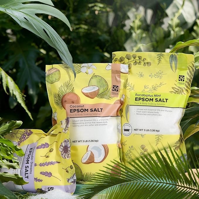 - Epsom Salt: The epsom salt is infused with epsom salt (Magnesium Sulfate) and essential oils. By adding a few epsom salts for soaking in a bathtub or foot bath, you can enjoy a comfy bath. Our Epsom salt can moisturize your skin
