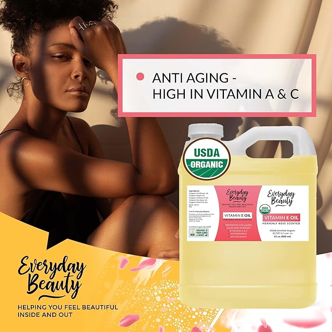 Organic Vitamin E Oil - Bulk 32 oz Heavenly Rose Scented USDA Certified 100% All Natural Plant Based - Light and Rose Scented Great for Scars After Surgery - For Face, Skin and Nails