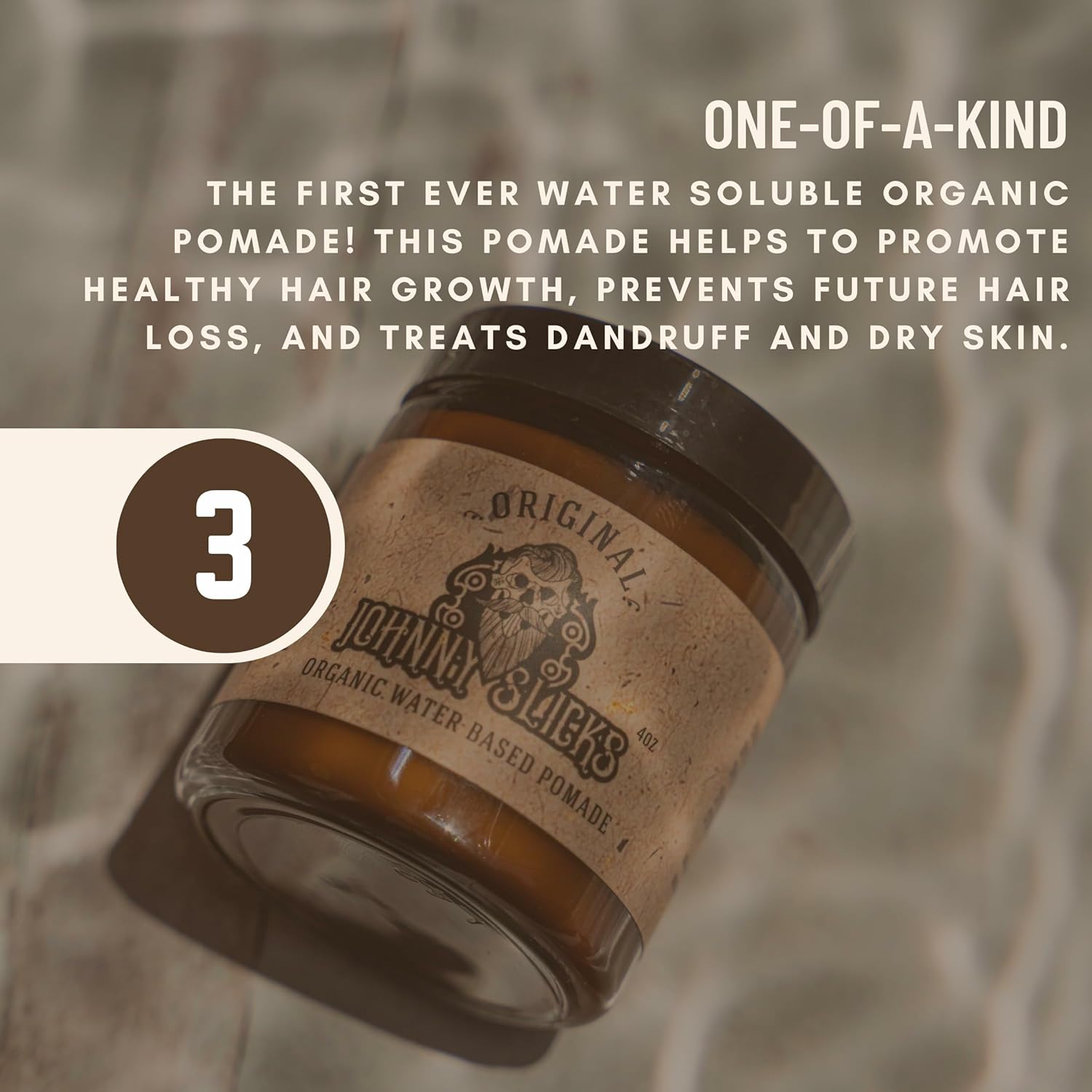 Johnny Slicks Water Based Pomade | Strong Hold, High Shine, All Organic Styling for Men | Promotes Healthy Hair Growth & Helps Hydrate Dry Skin (Rugged, 4 Ounce) US Made, Veteran Owned