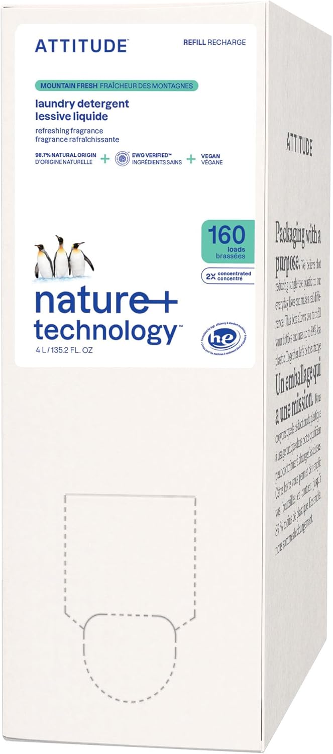 ATTITUDE Liquid Laundry Detergent Refill, EWG Verified, HE Compatible, Plant-Based & Vegan, Natural Laundry Soap, Mountain Fresh Scent, 160 Loads, 135.26 Fl Oz