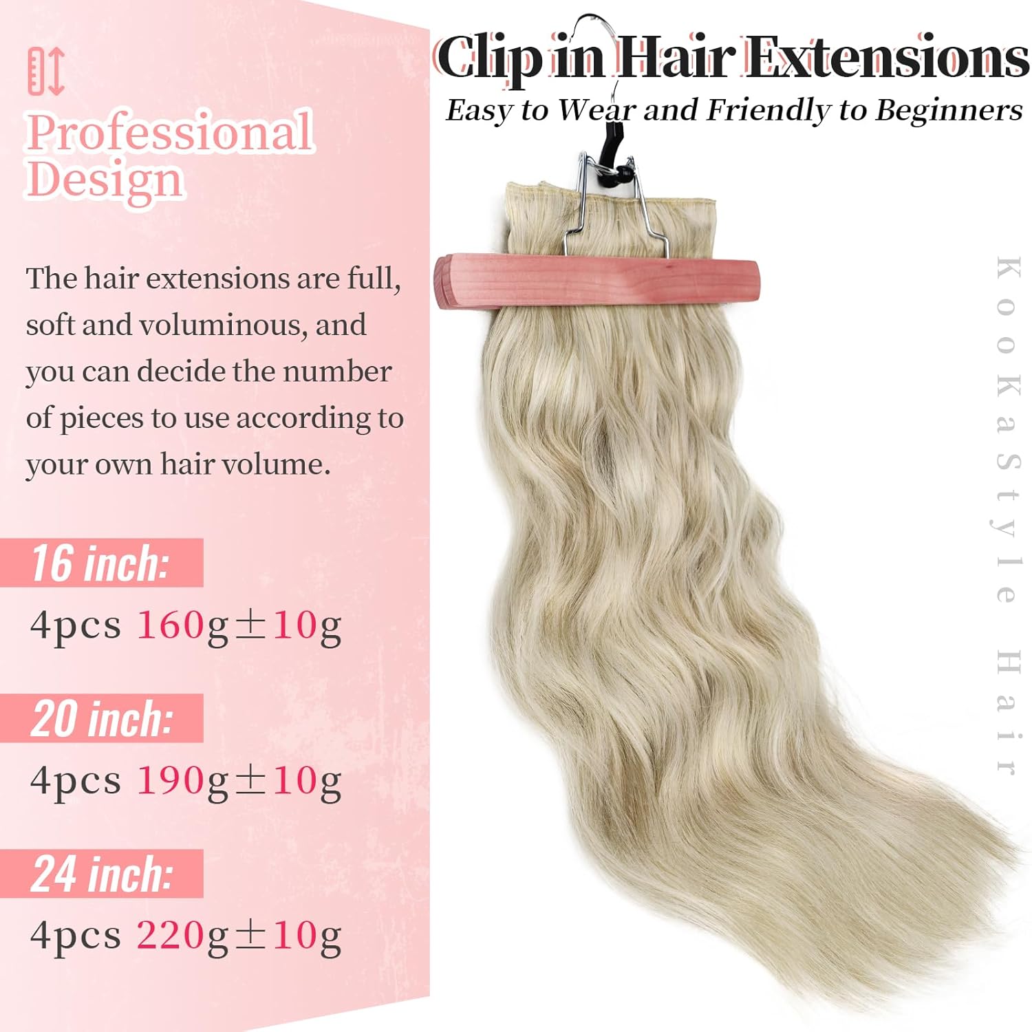 KooKaStyle Clip in Synthetic Hair Extensions Long Wavy 4PCS Thick Hairpieces Bleach Blonde mix Light Blonde Fiber Double Weft Natural Hair Extensions 20 Inch for Women