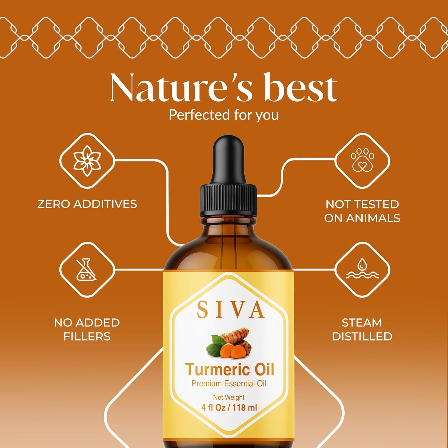 - Premium Quality Turmeric Essential Oil: SIVA Turmeric Oil 4oz is an essential oil and is obtained by steam distillation of Curcuma Longa roots. Our Turmeric curcumin oil is free of preservatives and comes with a dropper for easy application. It is not tested on Animals. We care for you!