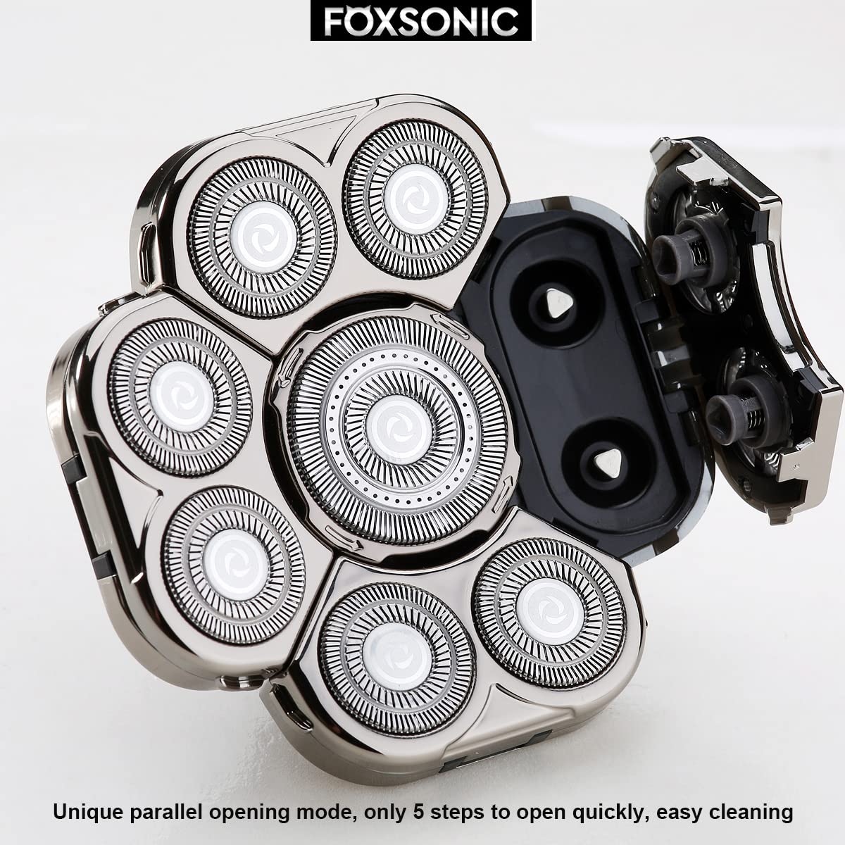- ★ Foxsonic 9 heads 9 blades men's electric shaver features special electroplate surfaces for anti-abrasion, double-ring hypoallergenic stainless blades. Its 9D flex floating heads rotate to follow the contours of your face, head, neck and jaw, offering closer and cleaner trimming without skin irritation.