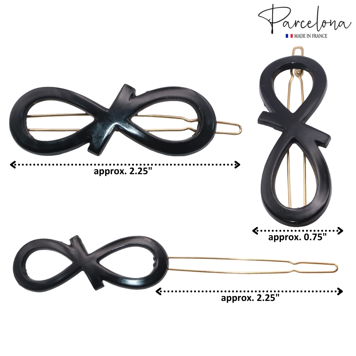 - The French infinity ribbon shape hair clip barrettes are a prime example of classic French design, simple yet elegant for women's hair accessories. These side clips feature strong tige boule golden clasp mechanism to hold hair in place and gives you quick styling solutions with non-slippery grip. The size of barrette is approx. 2.25 inch x 0.75 inch (5.75 cm x 2 cm).