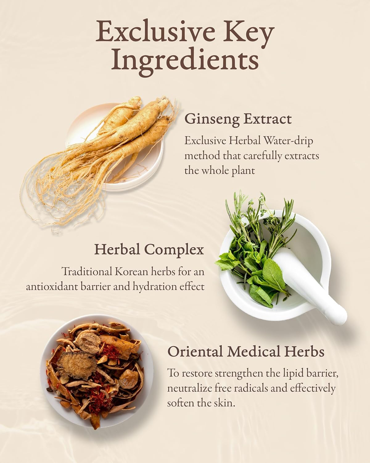 - GINSENG INFUSION HERBAL CARE - Sooryehan’s exclusive herbal water-drip technology where the whole ginseng plant (roots, stems, leaves) undergoes a 100-hour long extraction process to ensure all actives are potent and retains its full potential.