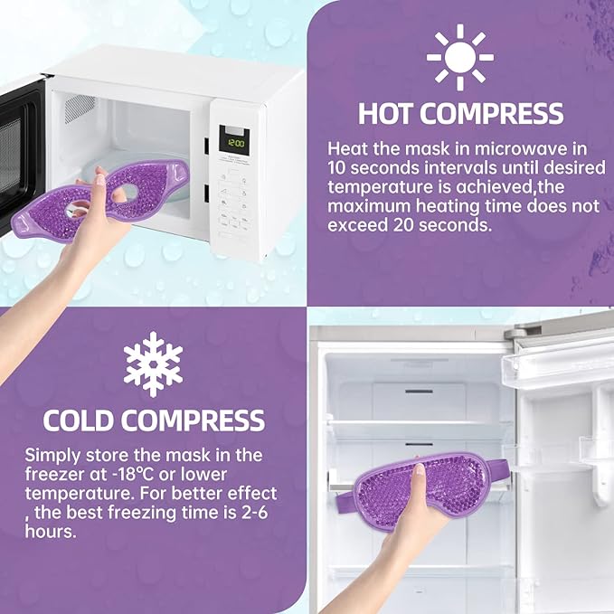 - Easy To Use:Sealed the eye mask in a plastic bag and simply store the mask in the freezer at -18℃ or lower temperature for at least 1 hours. For better effect,the best freezing time in the freezer is 2-6 hours .For heat therapy,heat the mask in microwave in 10 seconds intervals until desired temperature is achieved,the maximum heating time does not exceed 20 seconds. And the best therapy time is approximately 15 minutes recommended by doctor and therapist.
