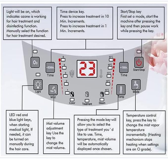 - Ozone light will be on, which indicates ozone is working for hair fixing and disinfection function, and select the function in the process of hair care as required manually.