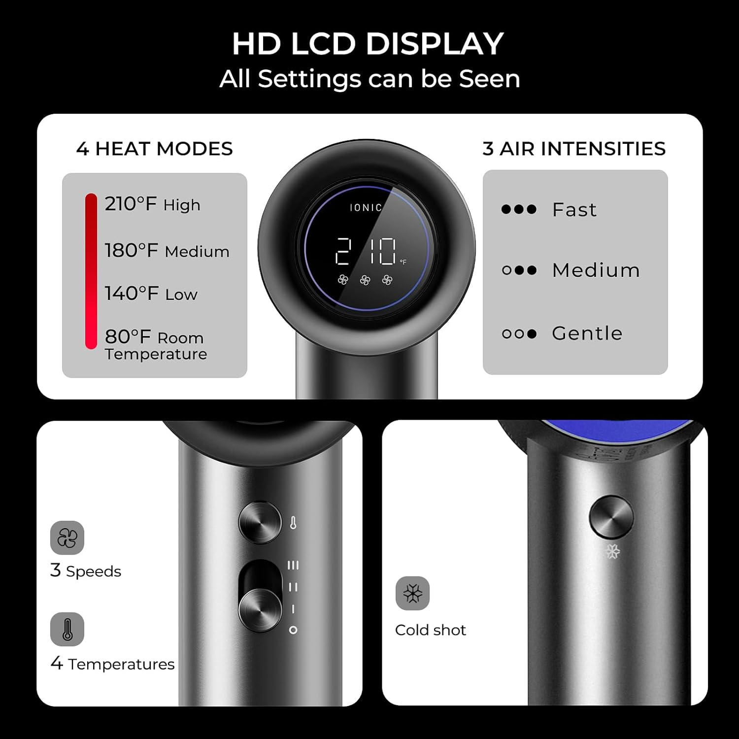 - 3 Speed, 4 Heats & Cool Shoot with LCD Display - There are 4 heat settings(Room Temperature/140℉/180℉/210℉) and 3 speed(Gentle/Medium/Fast) for you to dry your hair effectively and one-button cool shoot to set your styling. Besides, with HD LCD display, all settings can be seen which is more convenient to find the best setting to your hair types.