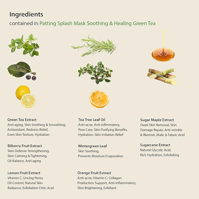 - STEP 1 FOR CLEANSING & EXFOLIATION: Patting Splash Mask Soothing & healing Green Tea is a traditional Korean face wash with Lactic Acid that helps to cleanse and remove dead skin, clarify impurities such as acne and blemishes, control sebum production.