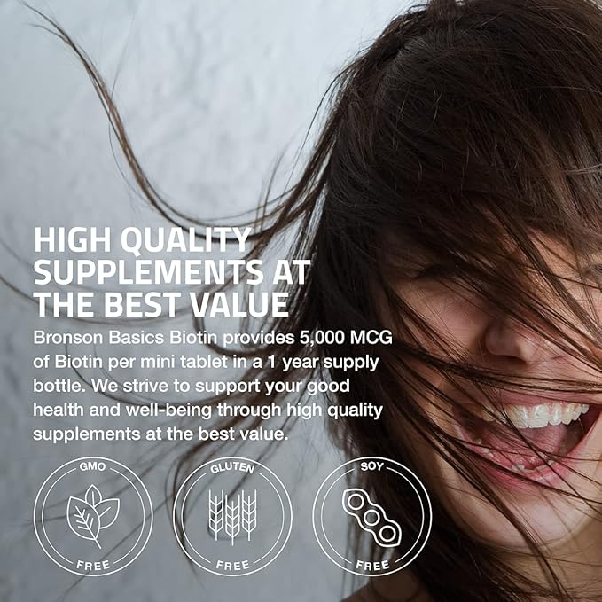 - High Quality & Great Value: Bronson Basics Biotin provides 5,000 MCG of premium Biotin per mini tablet in a 1 year supply bottle. We strive to support your good health and well-being through high quality supplements at the best value.