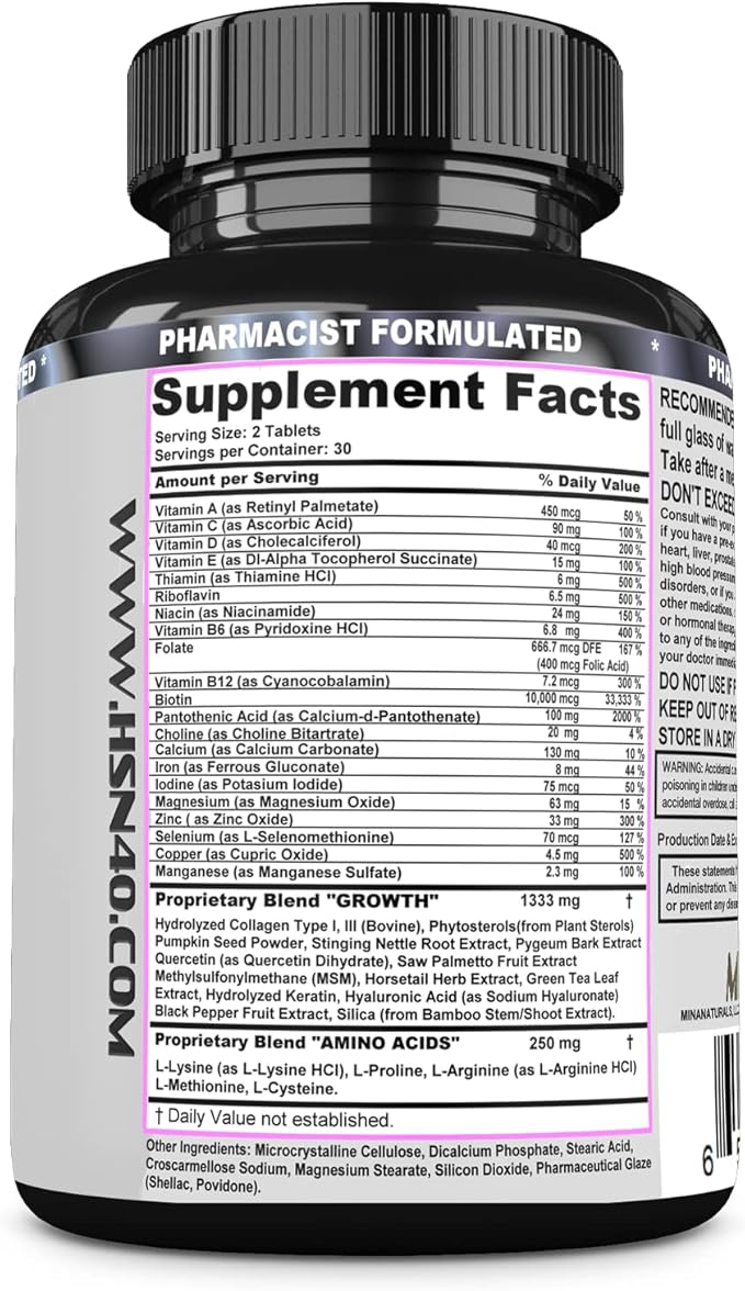 - Works for Women and Men to Intensively Nourish the Hair Follicle and Shaft and to enhance the Growth in Bald areas. 10000mcg of Biotin + B-complex vitamins, Choline, Folic Acid, Pantothenic Acid, Vitamins A, C, D and E, Calcium, Selenium, Zinc, Magnesium , Manganese, Iron, Cupper, Saw Palmetto, Pumpkin Seed Extract, Pygenium Africanum, Nettles, Plant Phytosterols, Green Tea, Quercetin, MSM, Silica, Keratin, Horsetail, and Hydrolyzed Collagen.