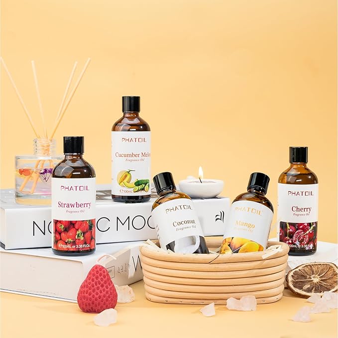 - PHATOIL Aromatherapy Oil: This fruity fragrance oil with a long lasting scent that pampers all your senses. Cruelty-free and never tested on animals.
