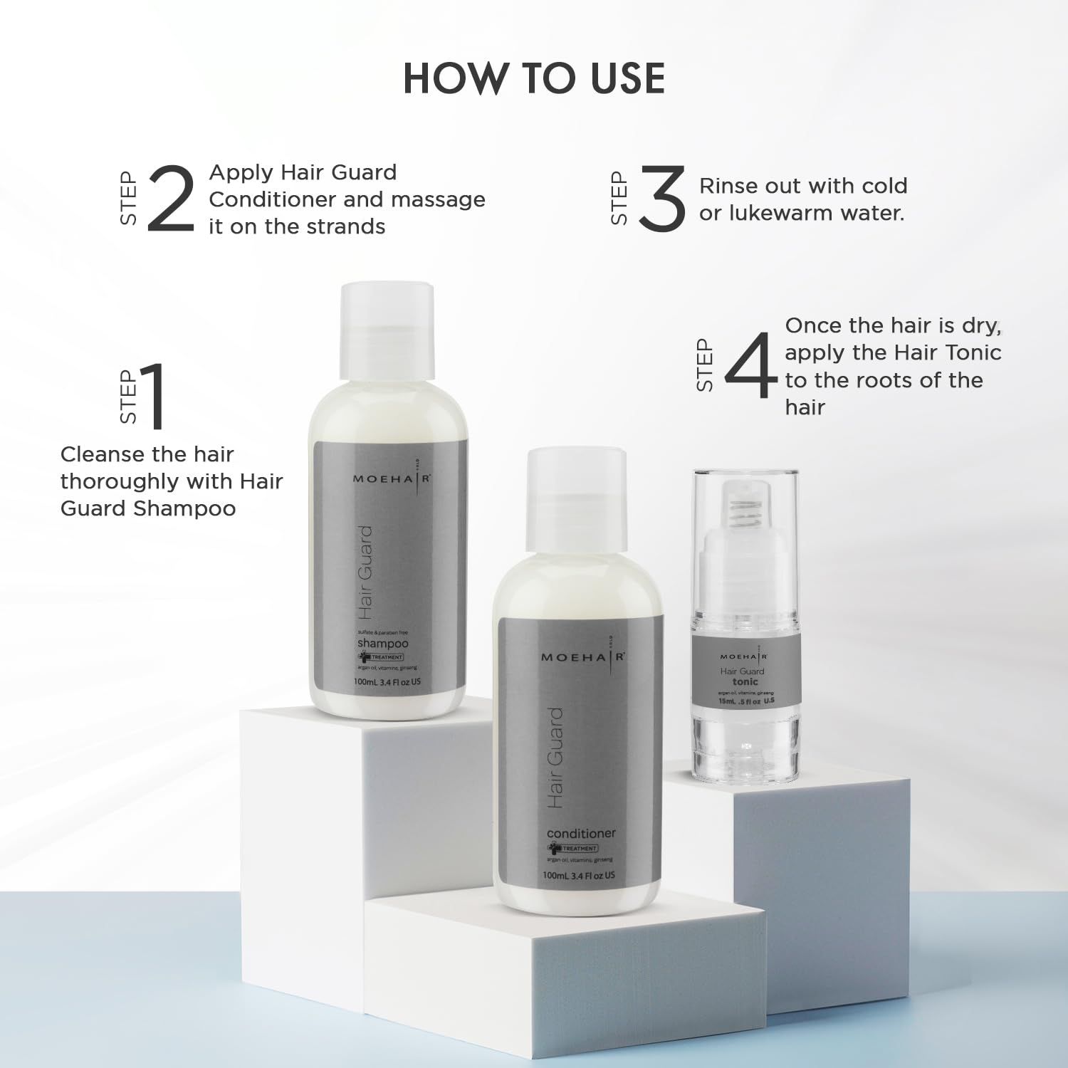 MOEHAIR Travel Trio Pack of Hair Guard Shampoo & Conditioner (3.4 Fl. Oz) with Hair Tonic (0.5 Fl. Oz) | Travel-Friendly | Improves Hair & Scalp Health | Paraben & Sulfate Free