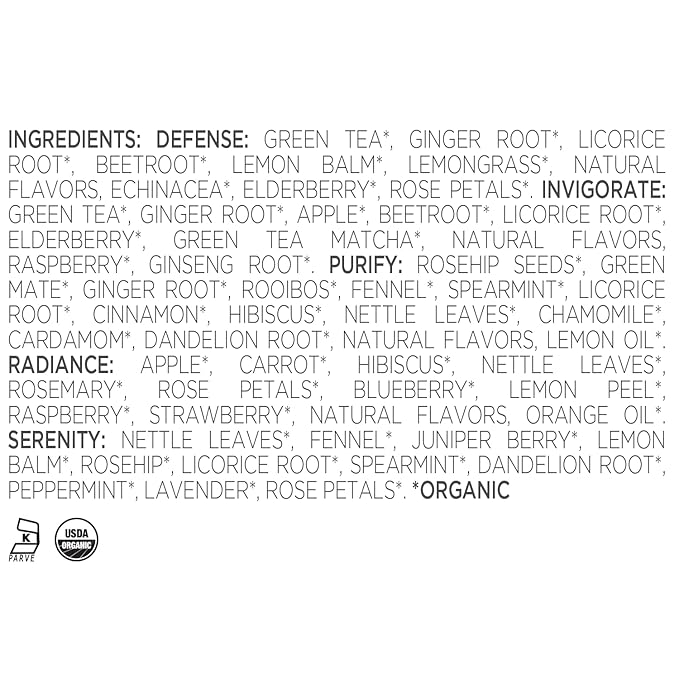 - SOPHISTICATED COLLECTION includes five organic tea blends, each packaged with a wellness and care theme, featuring 2 of each blend