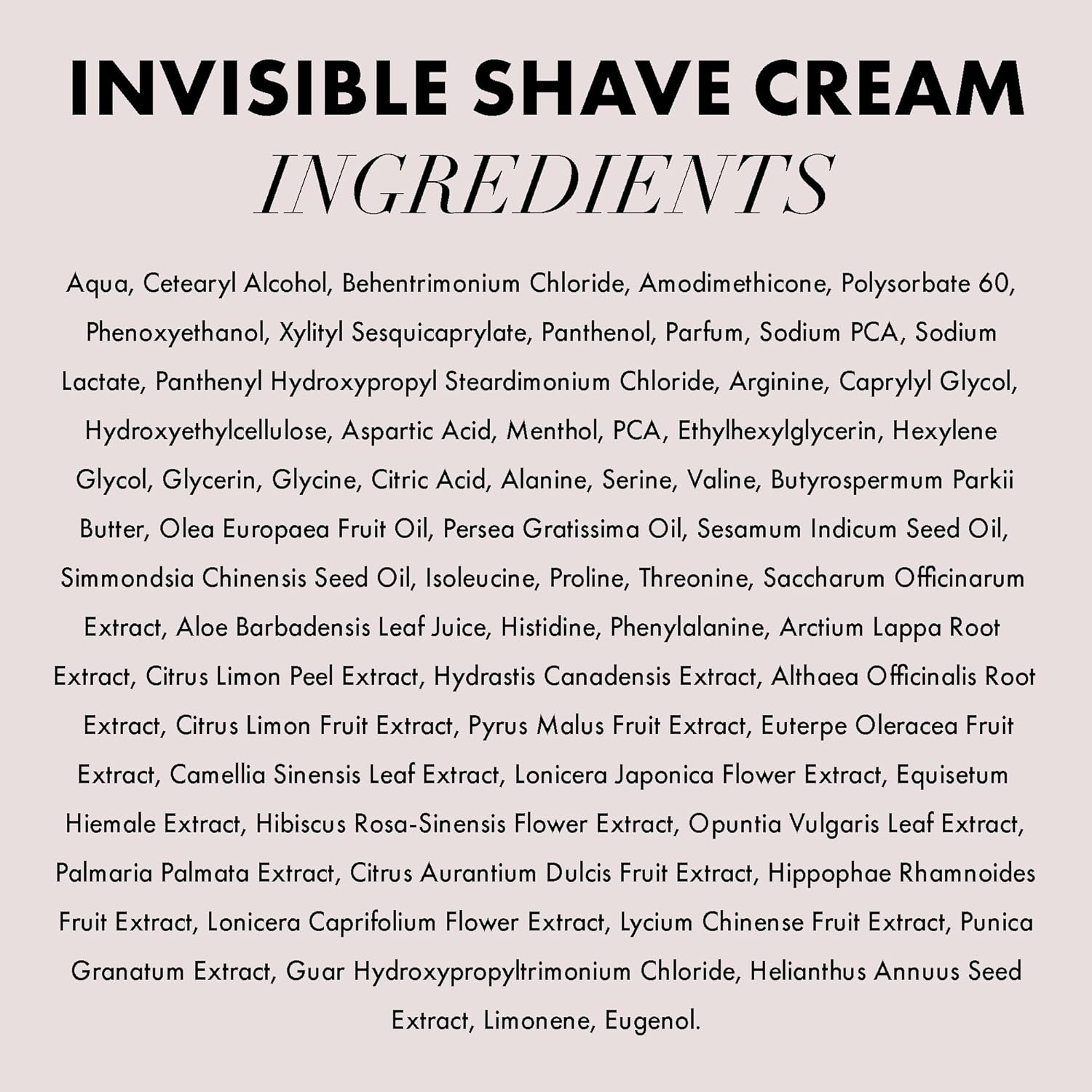 - Natural, Skin-Soothing Shaving Formula: Rich in botanicals, our Invisible Shave Cream has aloe vera, a natural blemish reducer, as well as avocado and jojoba seed oils to provide excellent, long-lasting skin moisturization