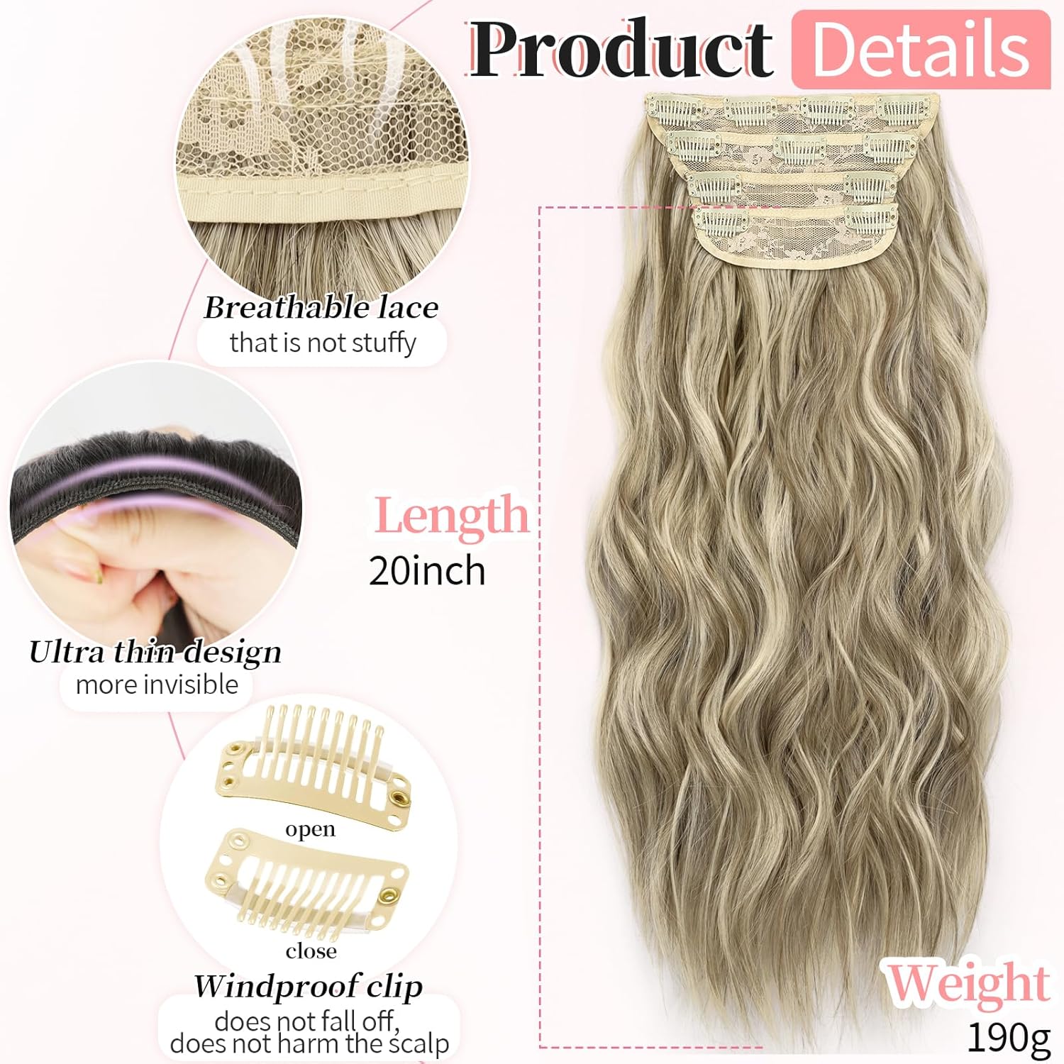 KooKaStyle Clip in Synthetic Highlight Hair Extensions Long Wavy 4PCS Thick Hairpieces Ashy Beige Blonde Balayage Fiber Double Weft Natural Hair Extensions 20 Inch for Women