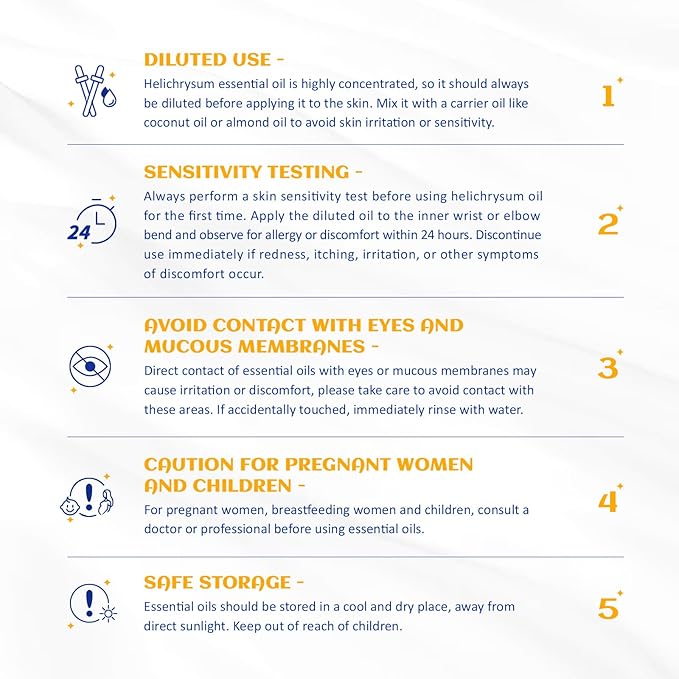 - Multiple Blend: Helichrysum essential oil can be blended with Bergamot, Chamomile, Geranium, Frankincense, Lavender, Sweet Orange, Rose essential oils. Dilute with carrier oil before use. Test on feet first for skin sensitivity prior to widespread use