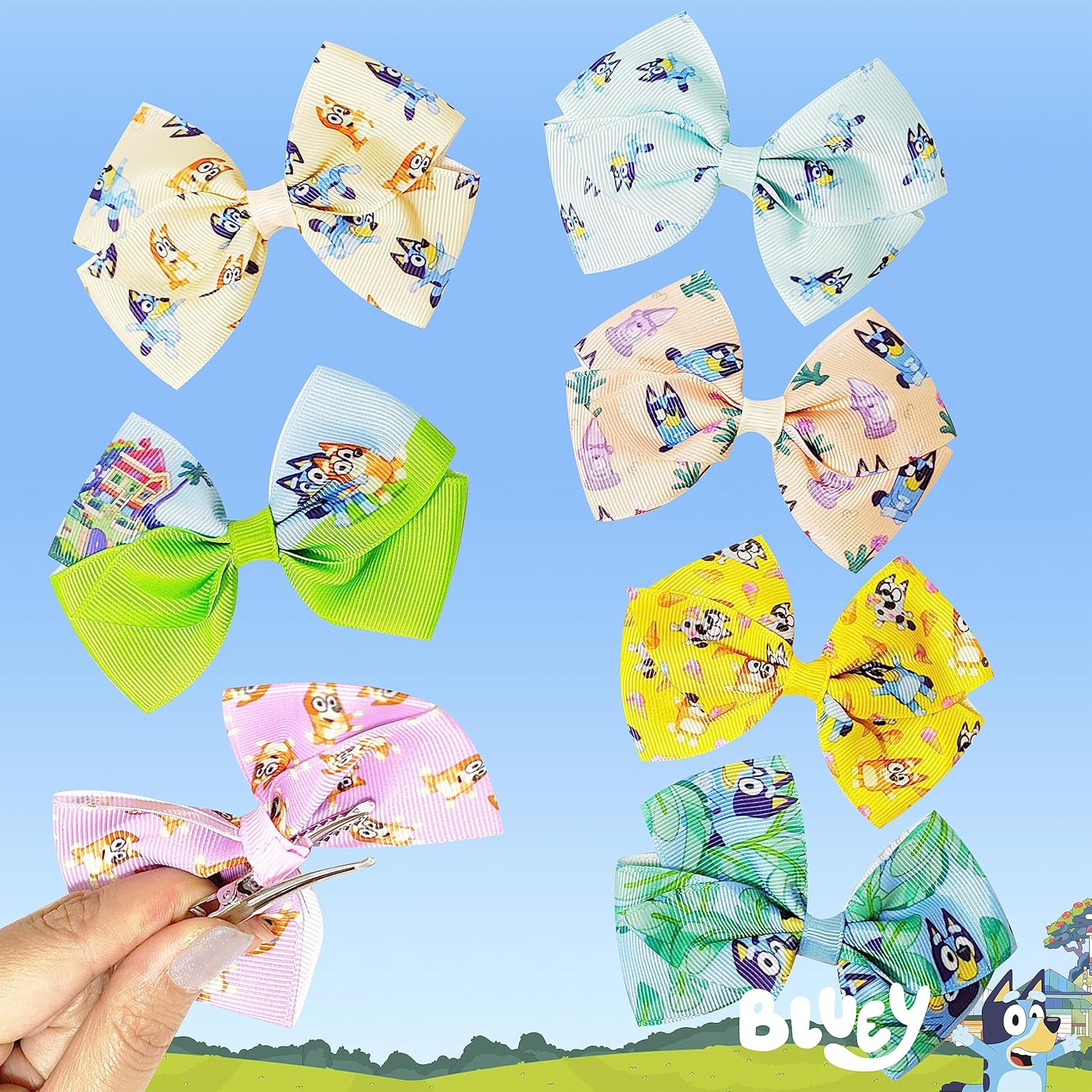 Bluey Kids Hair Bows - Hair Accessories Gift Set - Bluey Hair Bow - 7 Pcs 4 Inch Bow Bundle - HairBows for Girls - Different Bluey print on each clip - Alligator Clip - Ages 3 +