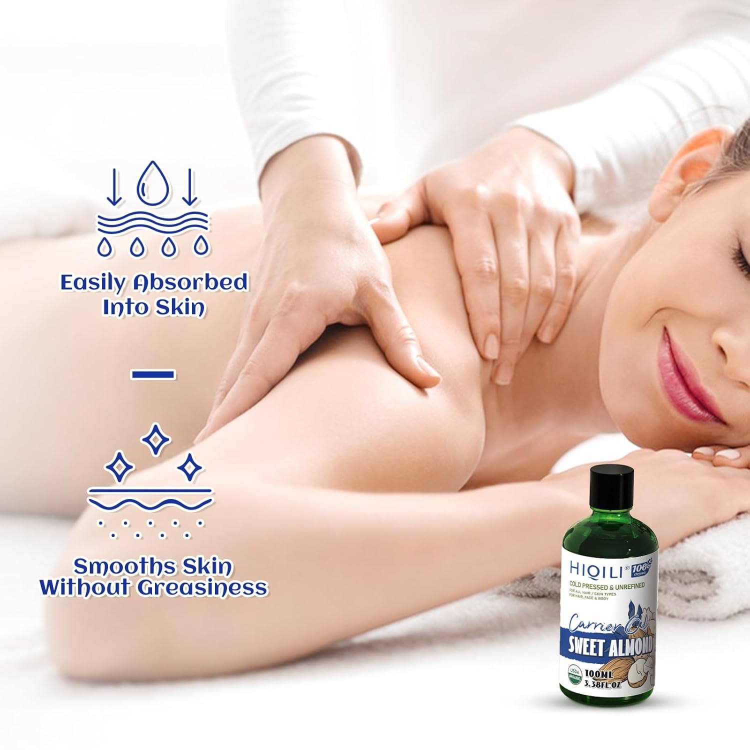 HIQILI Sweet Almond Oil, Skin, Hair Care, 100% Pure Organic Carrier Oil, Hexane Free, Unscented - 3.38 Fl Oz