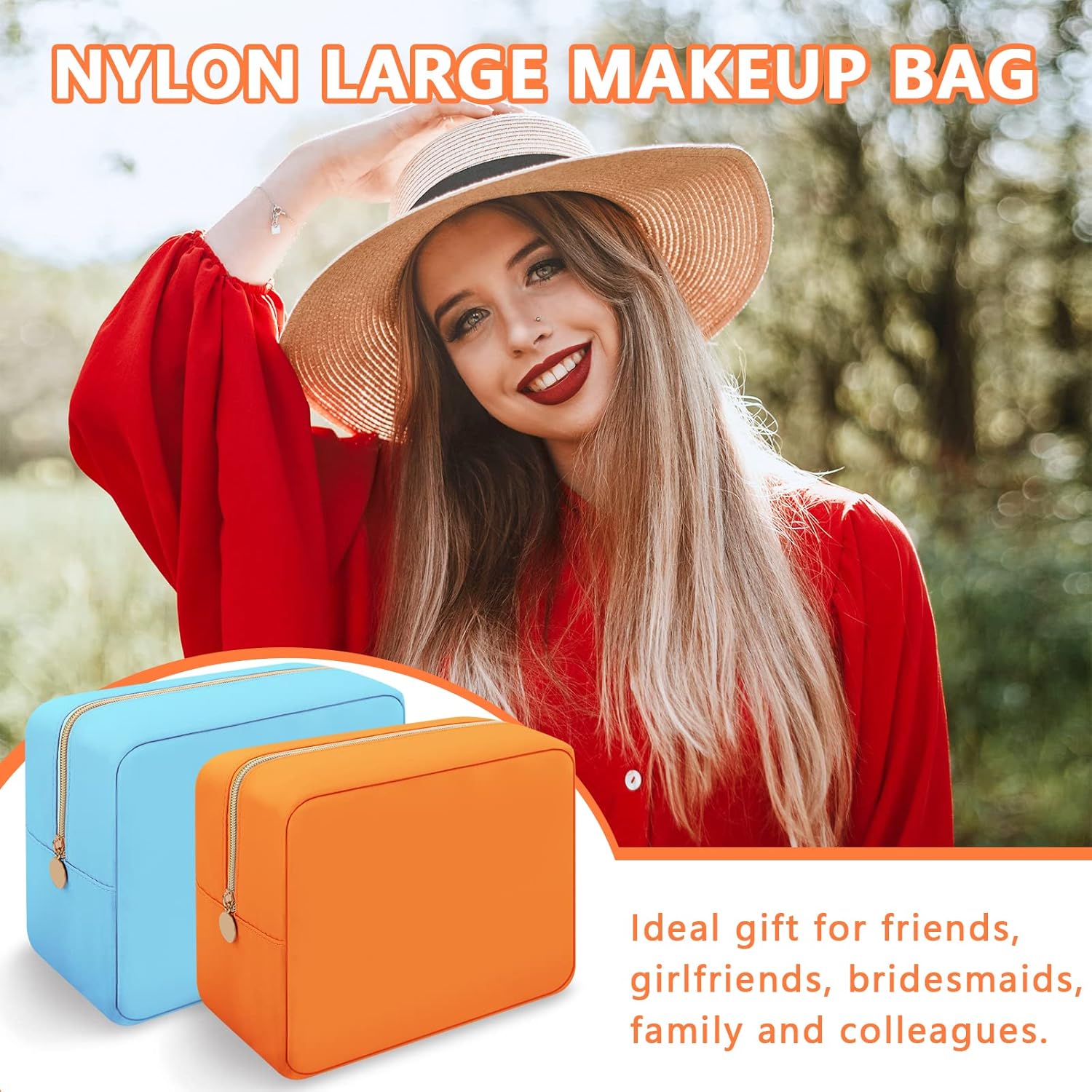 Iqimott Nylon Large Makeup Bag Travel Pouch, Preppy Cosmetic Organizer, Waterproof Toiletry Zipper Storage for Women Girls Teens (Orange)