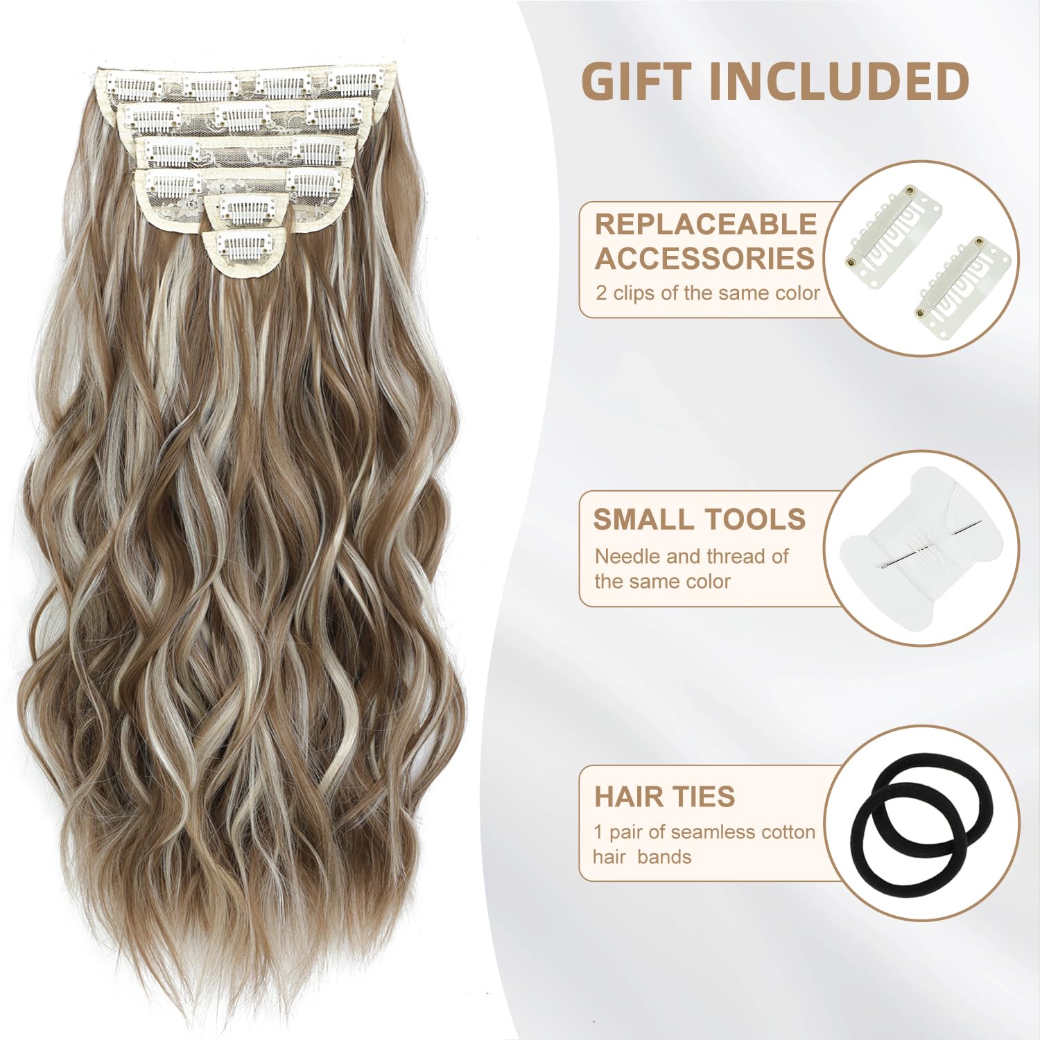 Clip in Hair Extensions for Women Brown with Blonde Highlights Long Wavy Hair Extensions Clip Ins 6PCS 20 Inch Synthetic Soft and Natural Thick Hair Pieces for Women