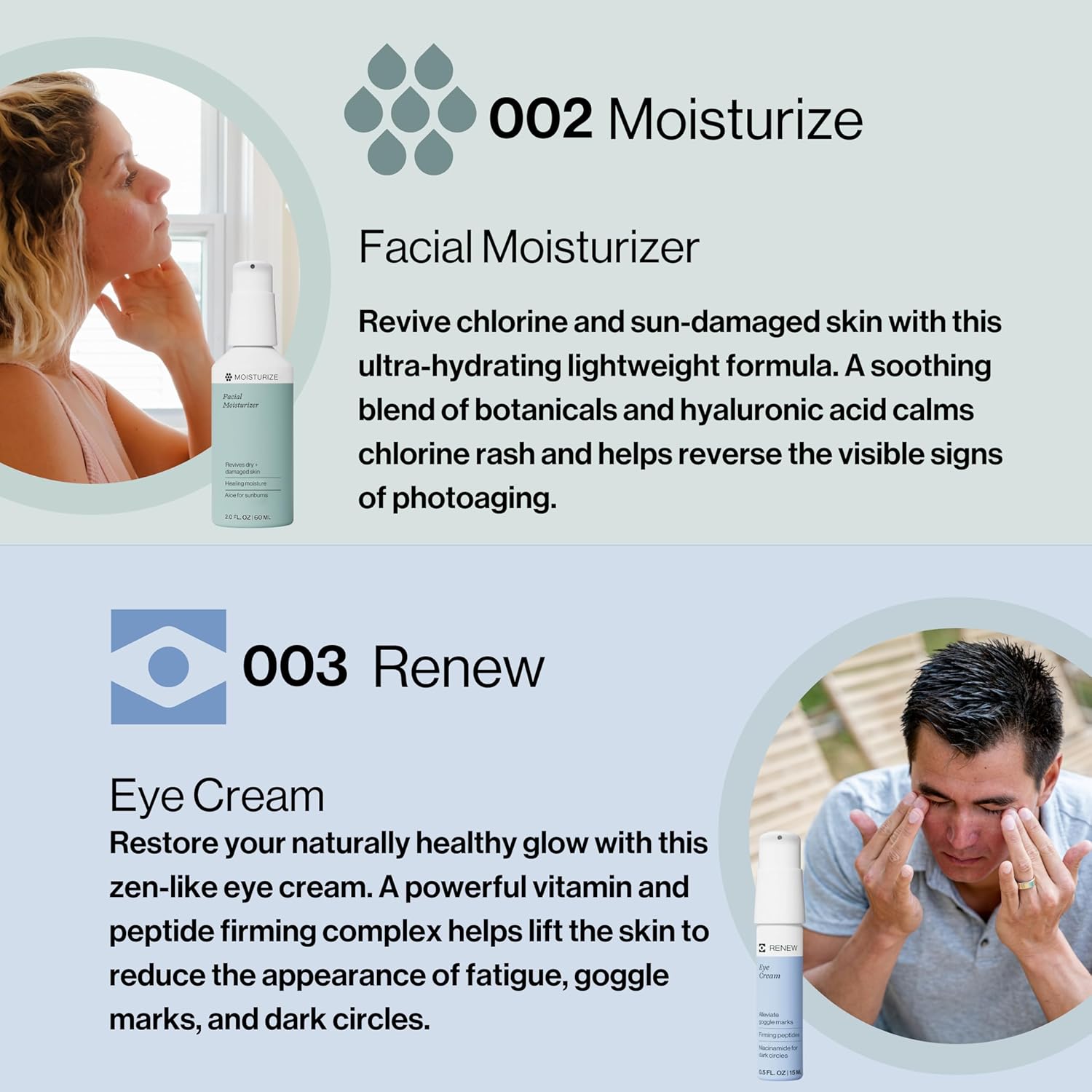 - Complete Skincare Set: Dive into the pristine assurance offered by Dermasport's skincare kit, a must-have in every triathlon bundle. Designed by swimmers, for swimmers, this system synergizes advanced skincare technology with potent natural ingredients for top-tier protection and nourishment. With our 4-step regimen, it's not just about triathlon swimming — it's a toast to healthier skin. The perfect oil free facial moisturizer, travel size cleanser, travel size eye cream, and reef-safe sunscreen.
