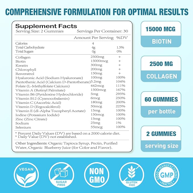 Biotin Gummies with Collagen, Keratin, Hyaluronic Acid, Vitamin for Skin, Hair Growth, Nails, Women Men Adults Kids - 60 Blueberry Flavored Gummies