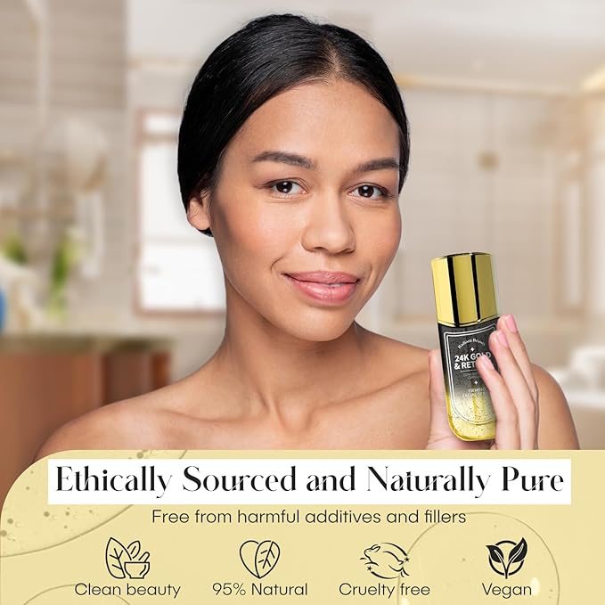 - NATURAL CLEAN INGREDIENTS: Our serum is crafted with clean, natural ingredients, free from parabens, phthalates, and GMOs. Enriched with 24K Gold and Retinol, it promotes cell turnover and combats signs of aging while ensuring a hypoallergenic formula.