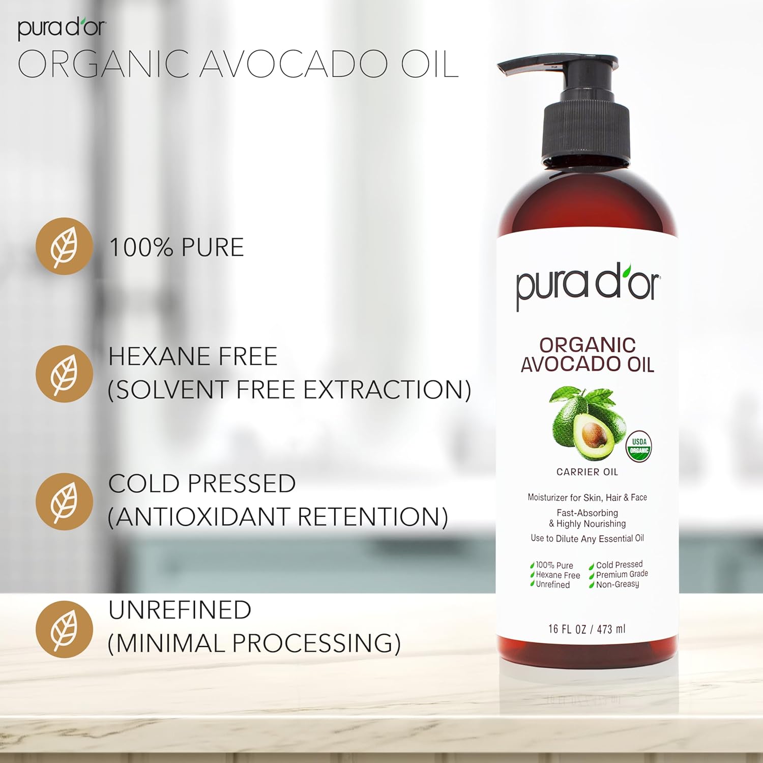 - PURA D'OR USDA ORGANIC AVOCADO OIL is your solution for supple, moisturized skin and strong, shiny hair. This carrier oil is entirely one healthy, 100% organic, natural ingredient.