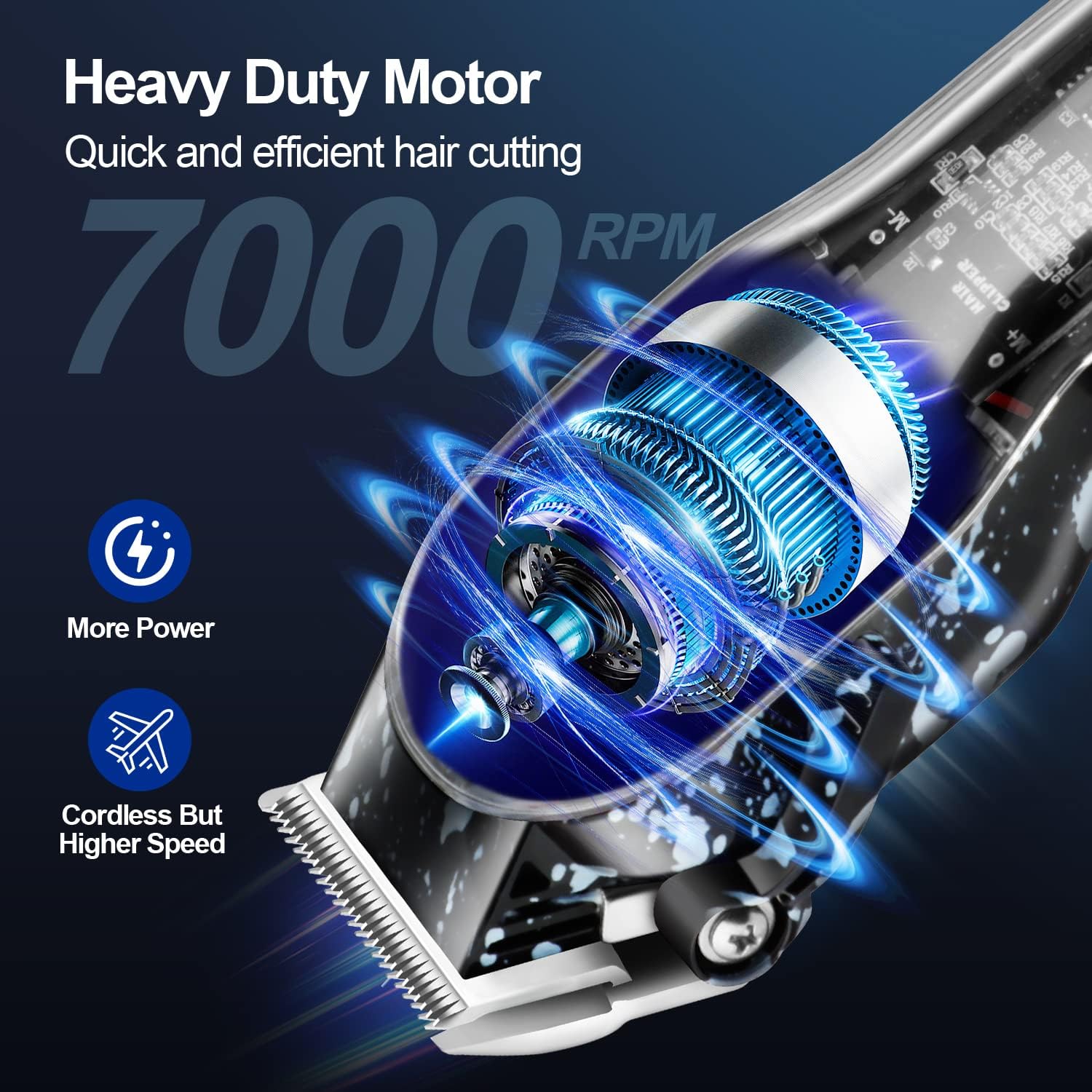 - 【Powerful Motor & Adjustable Blade mens Hair Clippers】: This wireless hair clipper machine has a 10W powerful motor with a speed of 7000 RPM. The hair clipper blade head is made of high-quality carbon steel, which is permanently sharp and non-permanent, suitable for all hair types. The left adjustment level change adjusts 3 different cutting lengths(0.5-1.7 mm).