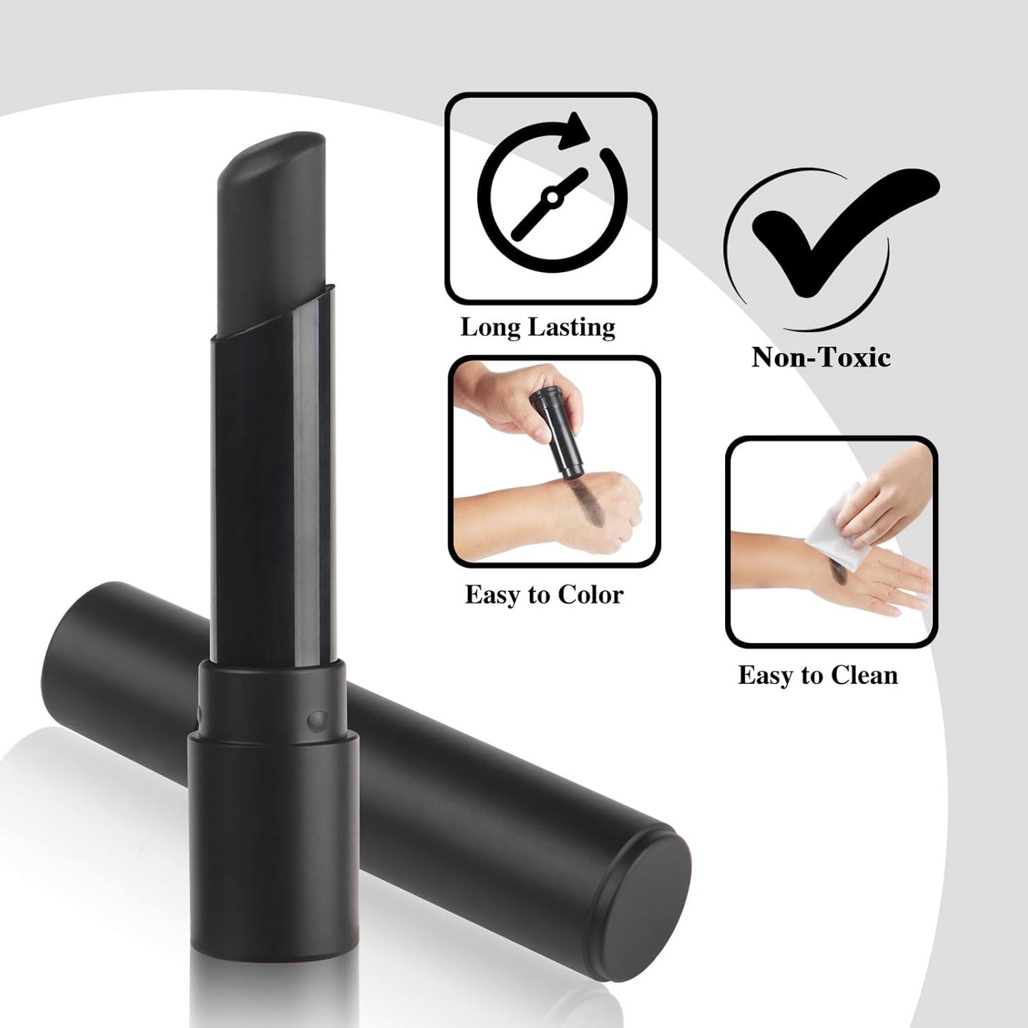- High Pigment:Highly pigmented black face paint stick,making it easy to color and have good coverage,only apply 1-2 layer for a great coverage.Fine texture ensures it evenly blend into the skin well,works well very smooth and stay around all day.It can also used as black eye black stick,Halloween lipstick,lip makeup for a wide range of cosplay.