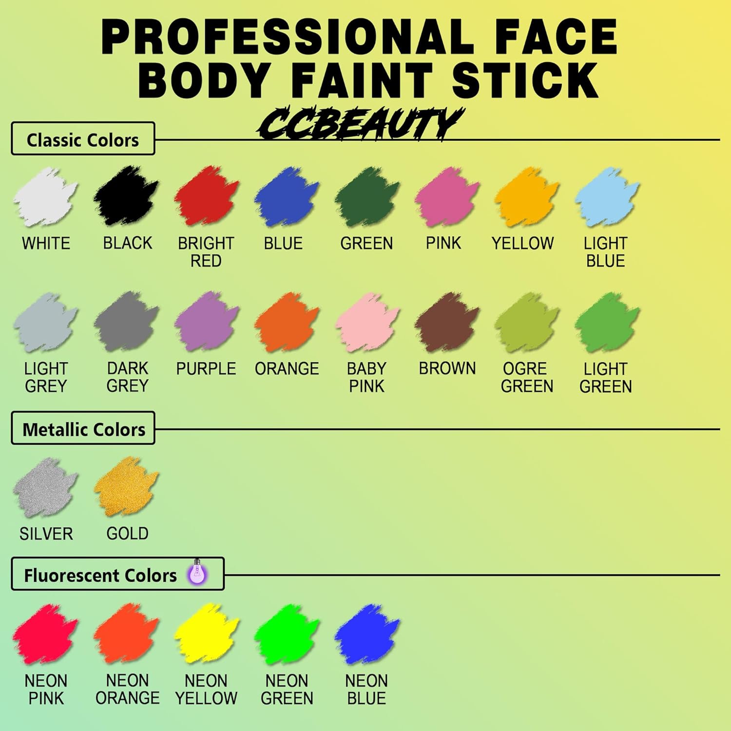 - ๐PRO FACE BODY PAINT STICK - CCbeauty's face and body paint sticks are manufactured using cosmetic grade ingredients, infused with Vitamin E and Aloe Vera. Provides high pigments to deliver you total full coverage with velvety consistency and intense colors payoff that will last you all day. Buildable, blendable cream formula with extreme long wear. Crack-proof, crease-proof, fade-proof, looks almost like second skin when wearing it.