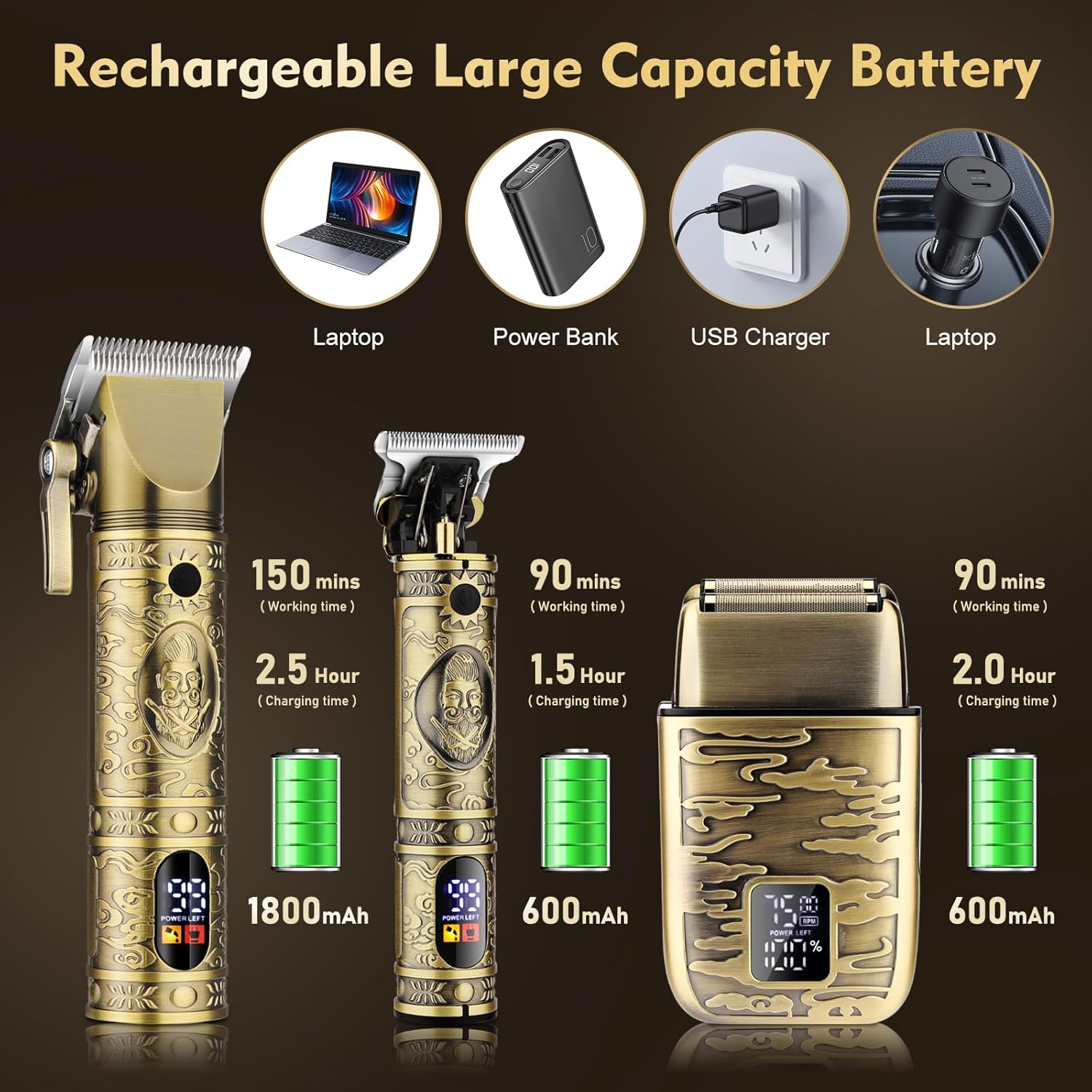 - 【LED Displays & Large Capacity Battery】- The men’s hair clippers set is built-in LED display that indicates when your hair clipper needs to be charged. Hair clipper features a rechargeable high-capacity Li-Ion battery that charges for 2.5 hours and provides up to 150 minutes of cordless runtime. USB charging port, you can connect USB adapter, laptop, car charger.
