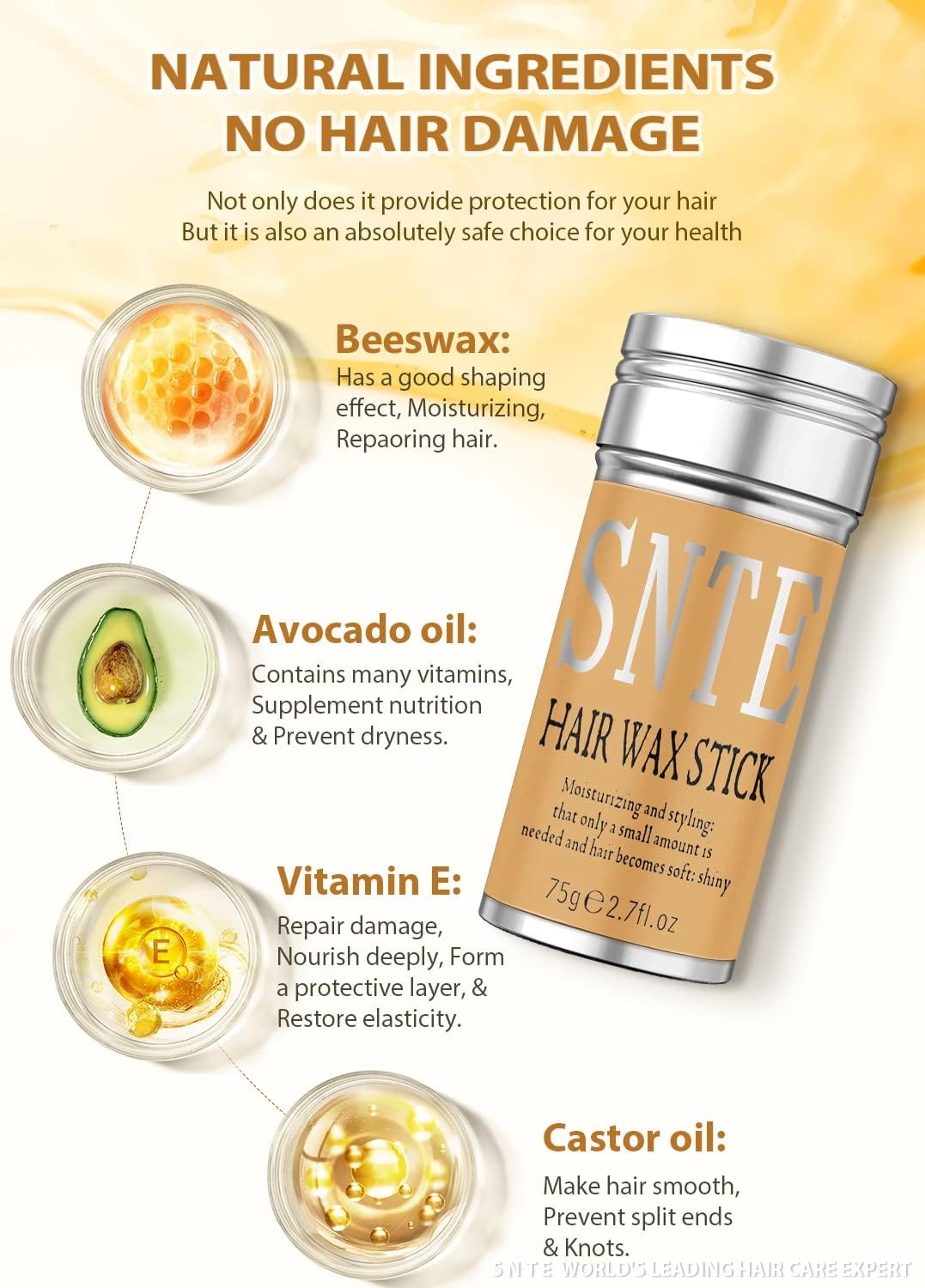 - 【Natural Botanical Ingredients Allow Hair to Breathe】Our hair wax stick contains 35% extra natural botanicals such as beeswax, castor oil and shea butter to deeply moisturize hair, smooth frizz and dryness, smoothen hair and fix hair style. The avocado botanicals in our hair finishing stick can brighten your hair, and does not contain any harmful substances and preservatives. Suitable for all hair types, the main focus is on clear and non-greasy, let hair breathe