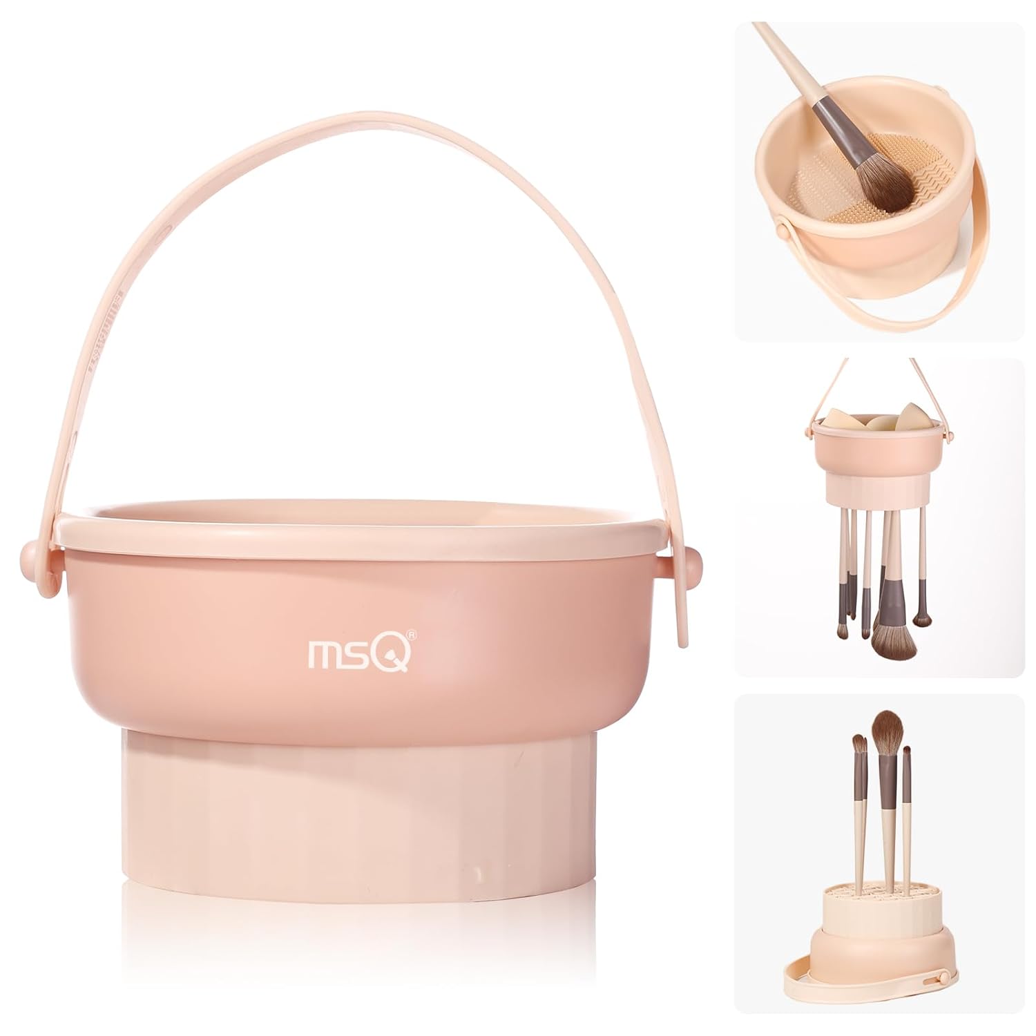 Makeup Brush Cleaning Mat, MSQ 3 In 1 Silicone Makeup Brush Cleaner Bowl with Brush Drying Holder, Makeup Scrubber for Makeup Brushes, Makeup Sponge, Powder Puff (Orange)