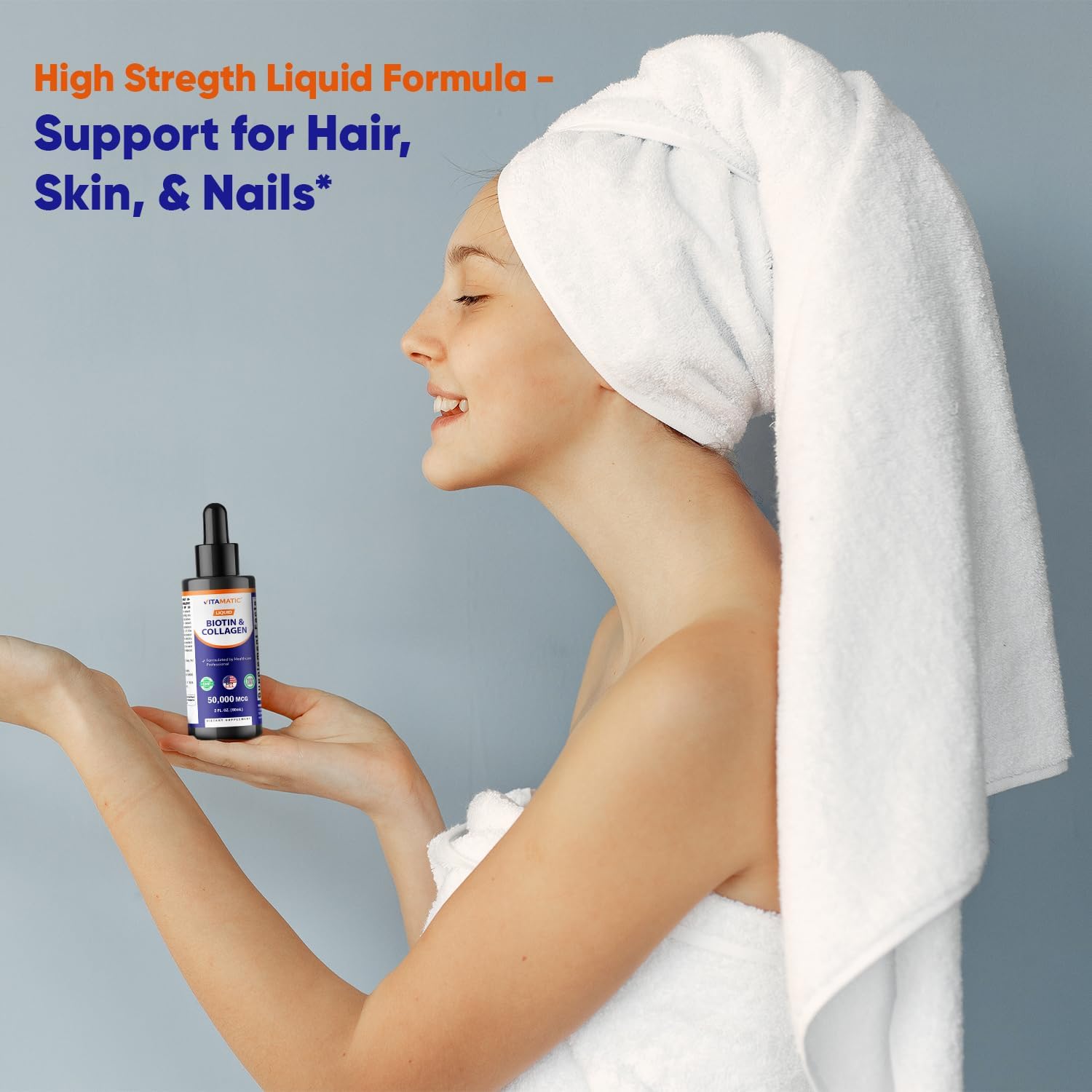 Vitamatic Liquid Biotin & Collagen Drops – 50,000 mcg – 2 fl oz Supports Healthy Hair Growth, Glowing Skin & Strong Nails – for Women and Men