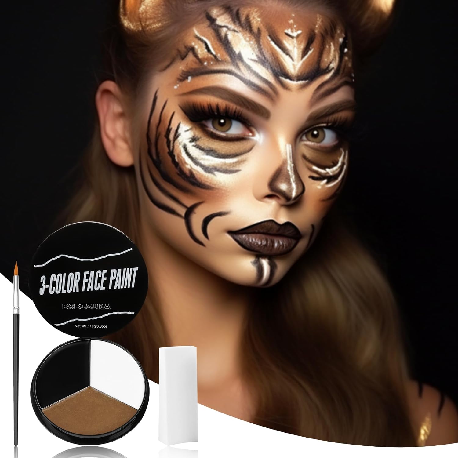 - This Halloween face painting kit comes with 3 intensive pigmented colors that applies easily with sponge and brush. Sponge could make blending, fading and smoothing effortless. Brush provides great control & precision for body and face painting.