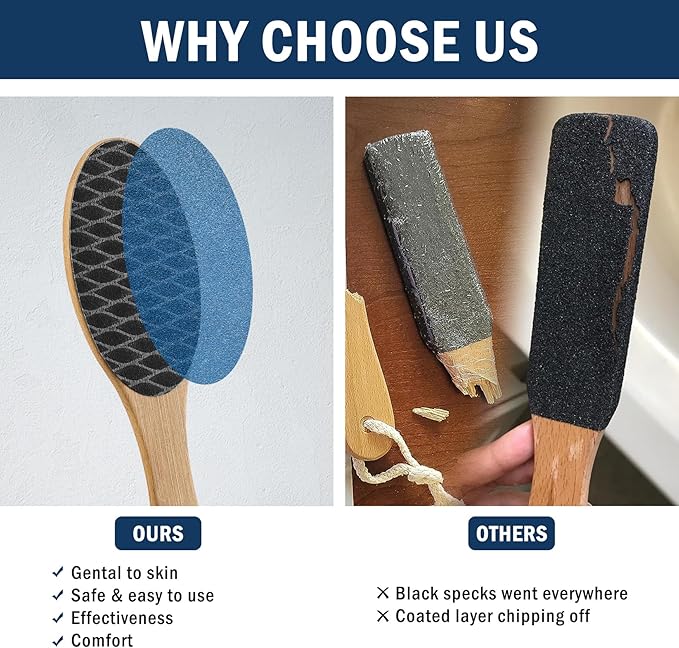 - Dual-Sided Foot File - Our bamboo handle foot rasp file features two sides, each designed to address specific foot care needs. The coarse side helps remove rough, calloused skin, while the fine side smoothens and exfoliates for a soft and polished finish. Experience salon-quality foot care in the comfort of your own home.