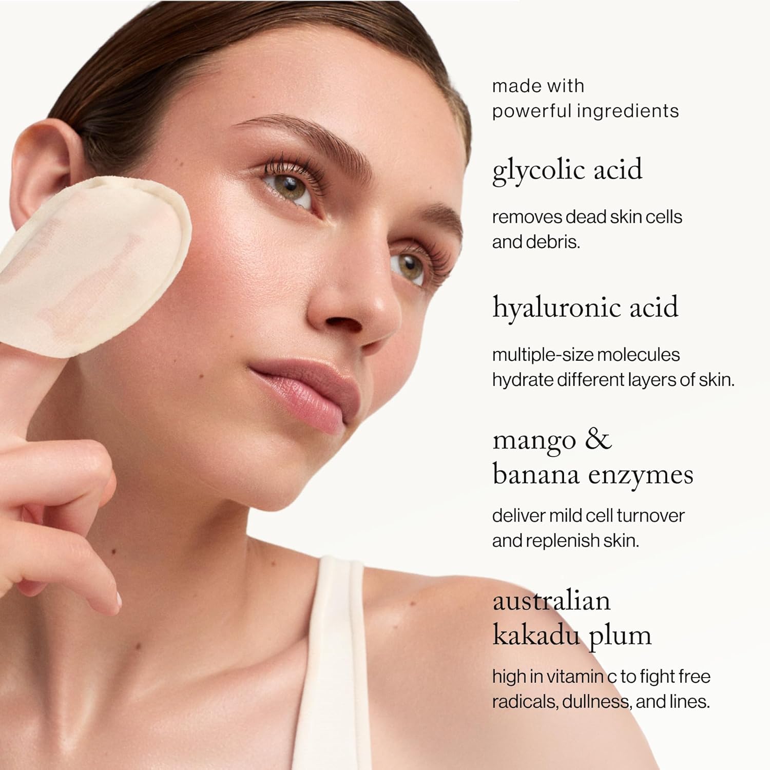 - Glycolic Acid Pads: A powerful level (15%) of glycolic acid and potent fruit extracts (mango, banana, yellow mombin, and Australian kakadu plum) work together with hyaluronic acid so you wake up with fresh, soft, smooth, beautifully glowing skin.