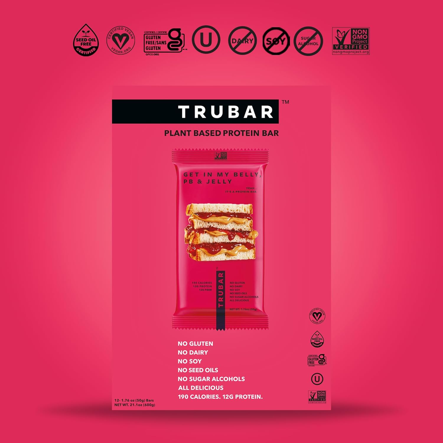 TRUBAR Vegan Protein Bar, Get In My Belly Pb & Jelly, Gluten Free, Plant Based, High Fiber, Dairy Free, Low Fat, Non GMO, No Sugar Alcohols, 12G Lean Protein, 13G Fiber, Healthy Snack Bars, 12 CT
