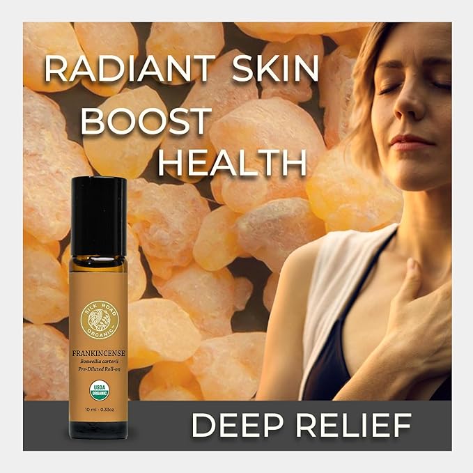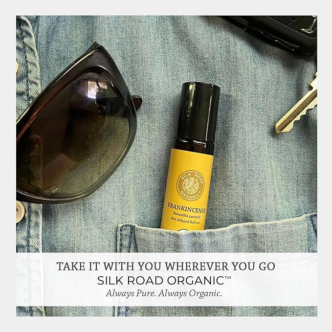 Silk Road Organic Frankincense Carterii Essential Oil Roll On, 100% Pure USDA Certified Aromatherapy for Radiant Skin, Body Aches, Stress Relief, & Calm - 10 ml Roller