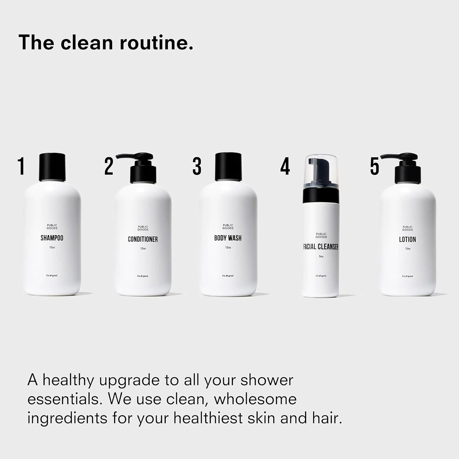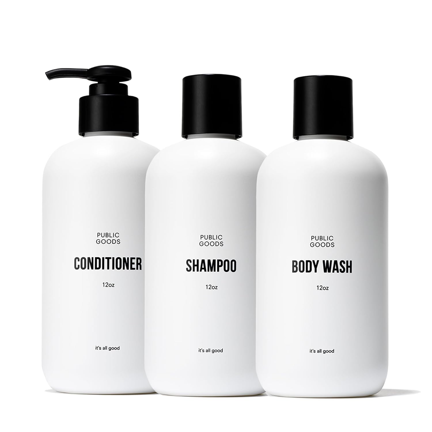 Public Goods Shower Essentials for Men and Women | Natural Shampoo, Conditioner & Body Wash | Made with Organic Essential Oils | Sulfate & Paraben Free | Vegan Friendly | 12 Fl Oz Bottles