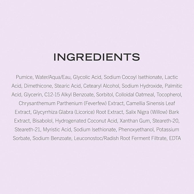 - Buff Away Dead Skin: Glycolic and Lactic Acids at a combined level of 10% help loosen skin’s top layer and decongest pores, while Pumice Buffing Beads (NOT microplastic!) whisk it all away