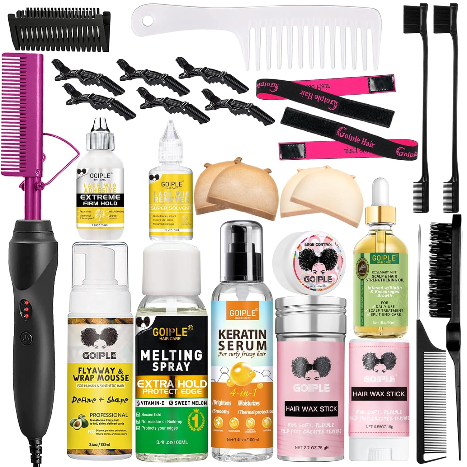 - 【28Pcs Electric Hot Comb Set】The package included:1pc electric hot comb+1pc plastic protective cover+1pc 3.4fl.oz keratin serum+1pc 3.4fl.oz lace melting spray+1pc 3.4oz hair mousse+1pc 1fl.oz hair growth oil+1pc 2.7oz hair wax stick+1pc 0.56oz hair wax stick+1pc 1.05oz edge control+1pc 3.4fl.oz wig glue+1pc 1fl.oz wig glue remover+1pc black hair comb+1pc bristle brush+2pcs double-sided edge brush+2pcs elastic bands for wig+6pcs hair clips+1pc wide tooth comb+4pcs wig caps.All the tools ready for you!