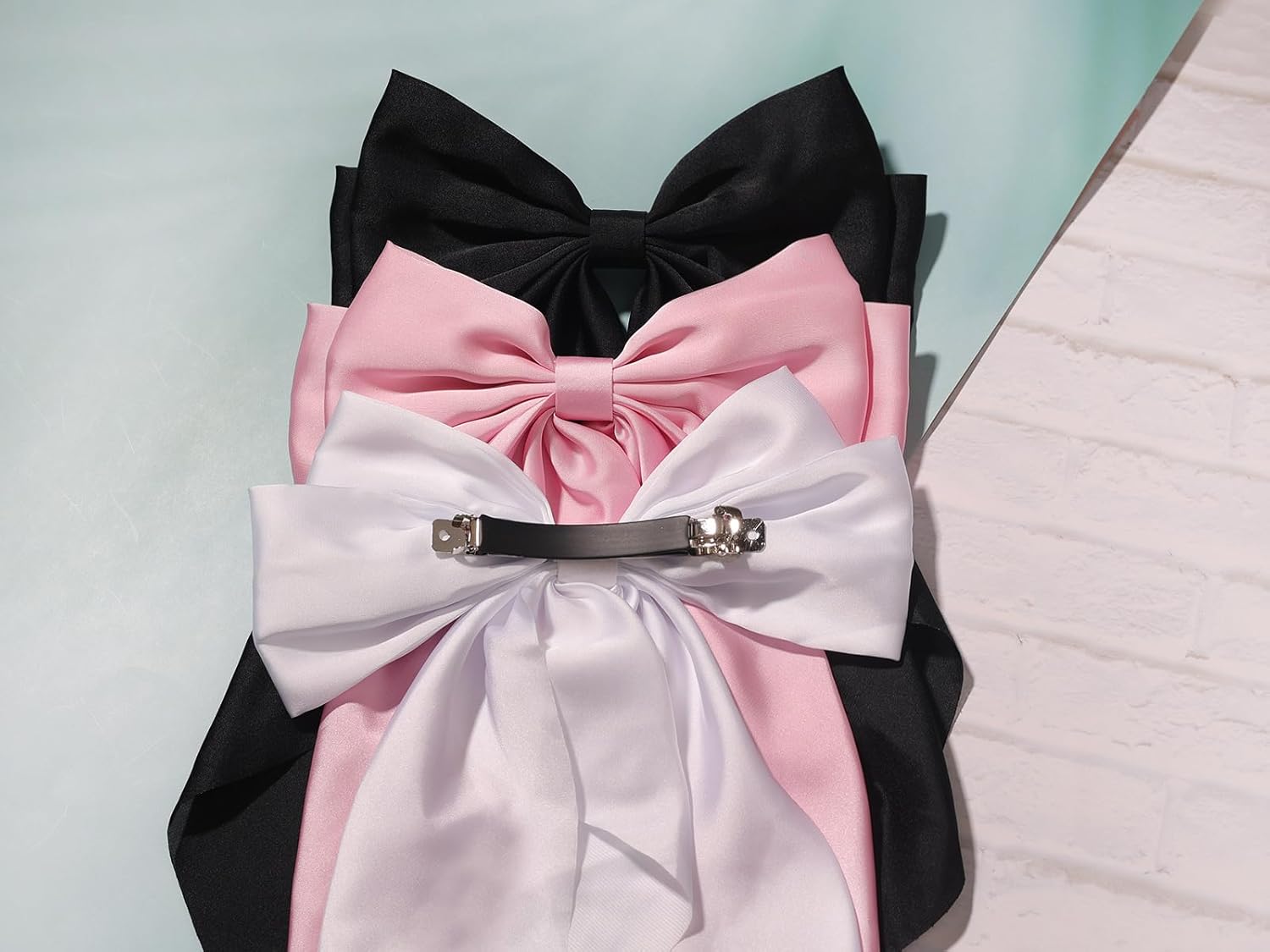 - CUTE HAIR ACCESSORIES: Hair bows made of satin material and metal clips. Silky and soft to touch. 3 colors to choose from, including black bow, white bow and pink bow. Adorable design can make you more eye-catching, elegant and charming
