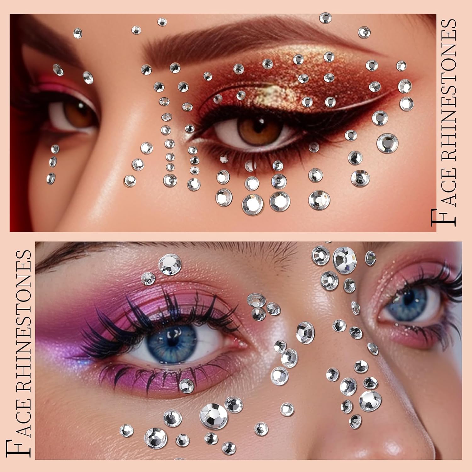 - 【FACE JEWELS STICK ON】Self-adhesive face gems offer superior adhesion and long-lasting wear. Say goodbye to worries about gems falling off during your favorite activities. But for longer-lasting wear or on oily skin, using additional adhesive like eyelash glue is recommended