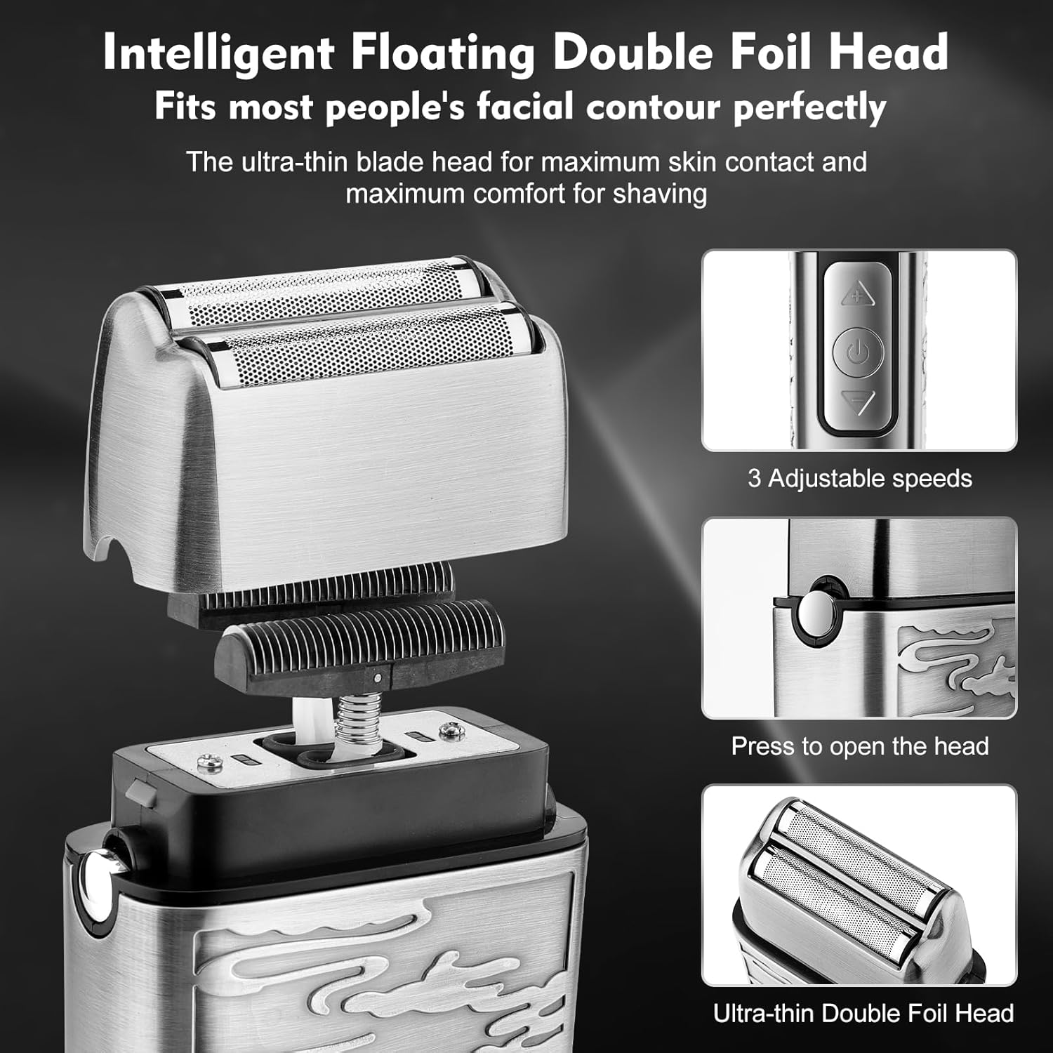 - 【Smart Floating Double Foil Head】- The electric shavers razor comes with smart double float shaving head with thin and smooth foil blade mesh that closely follow the contours of the face, with a three-speed shift adjustment, bring you with a comfortable quick and clean shave. Electric shavers full body with IPX6 waterproof design. You can rinse directly under the tap for easier cleaning.