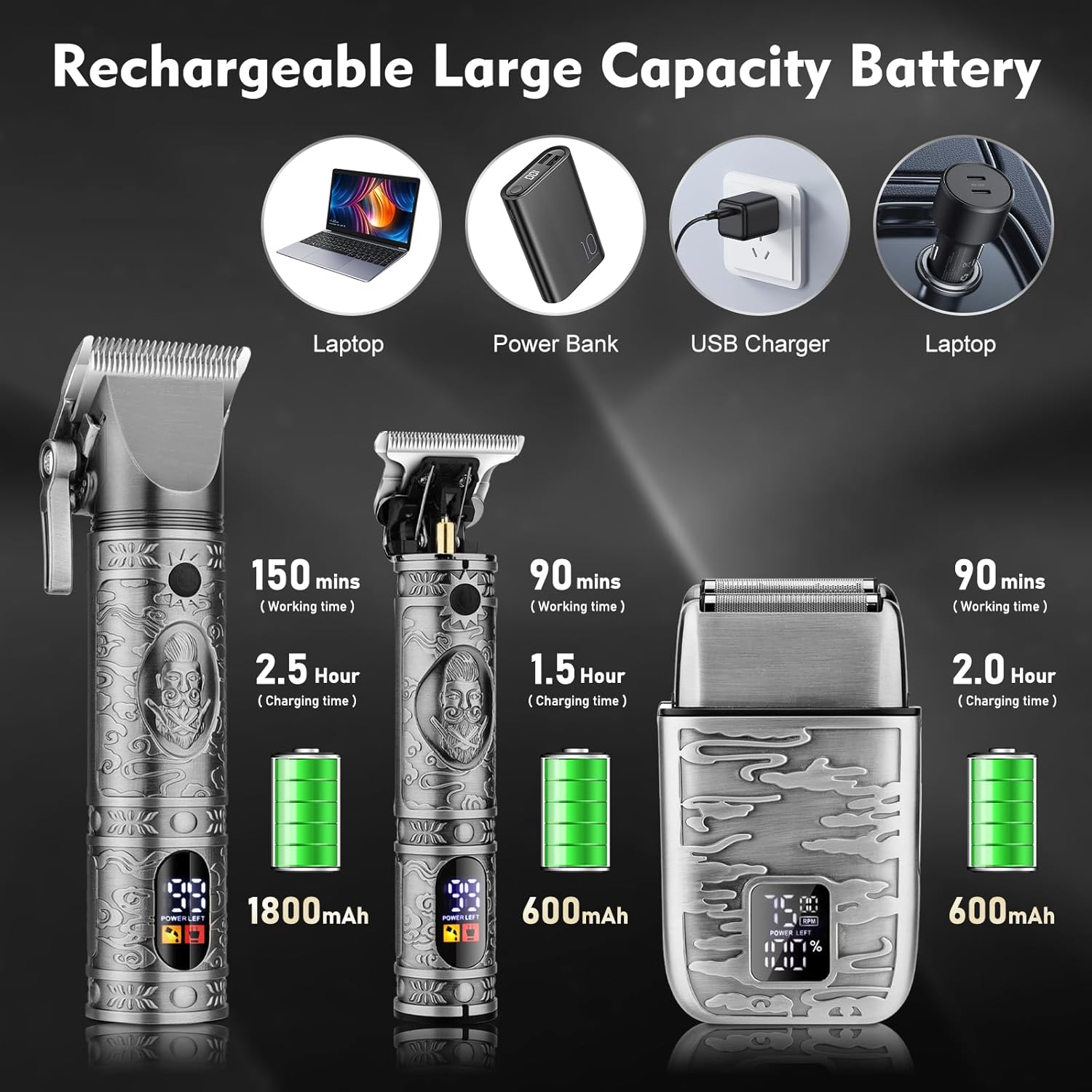 - 【LED Displays & Large Capacity Battery】- The men’s hair clippers set is built-in LED display that indicates when your hair clipper needs to be charged. Hair clipper features a rechargeable high-capacity Li-Ion battery that charges for 2.5 hours and provides up to 150 minutes of cordless runtime. USB charging port, you can connect USB adapter, laptop, car charger.